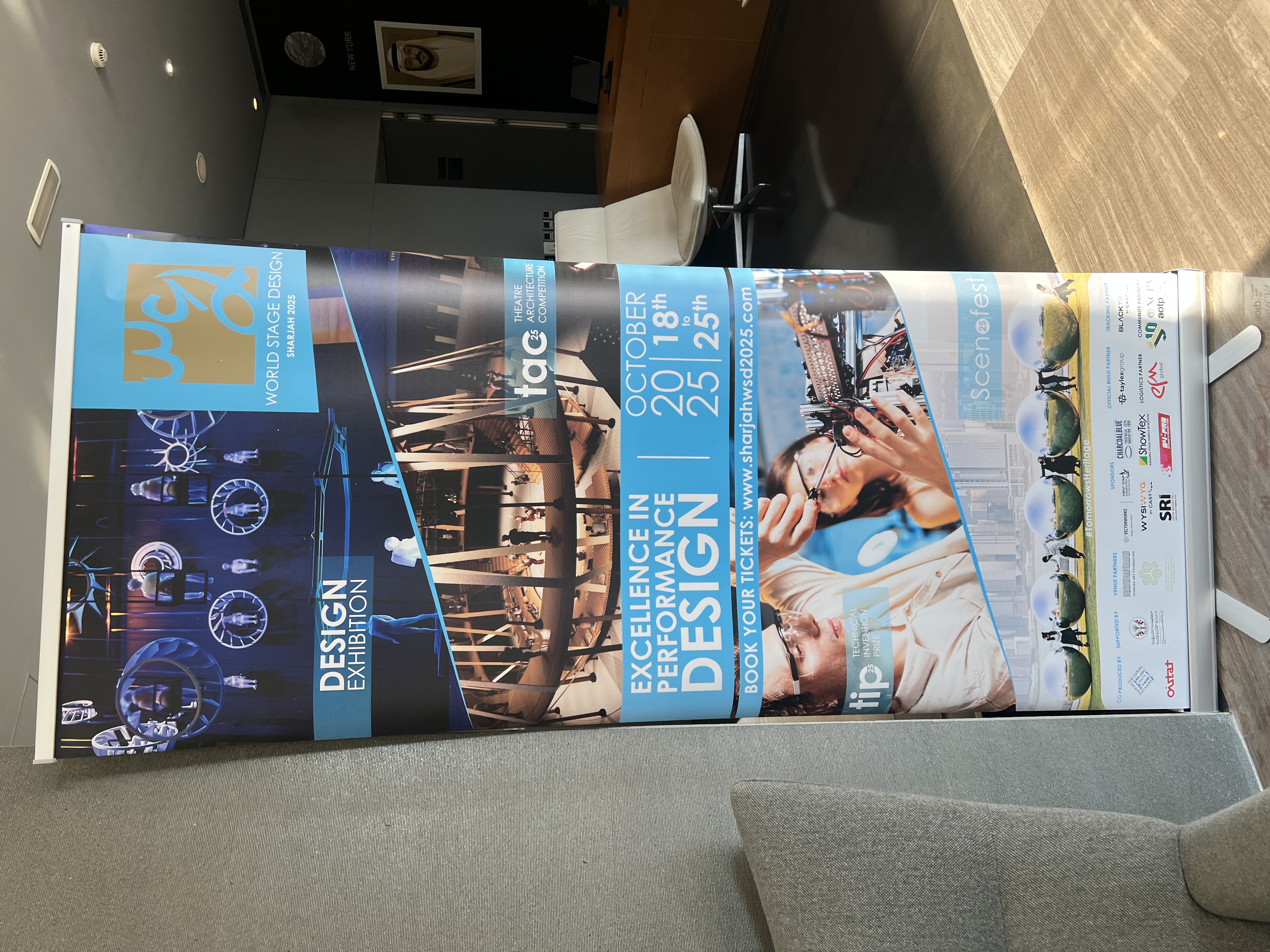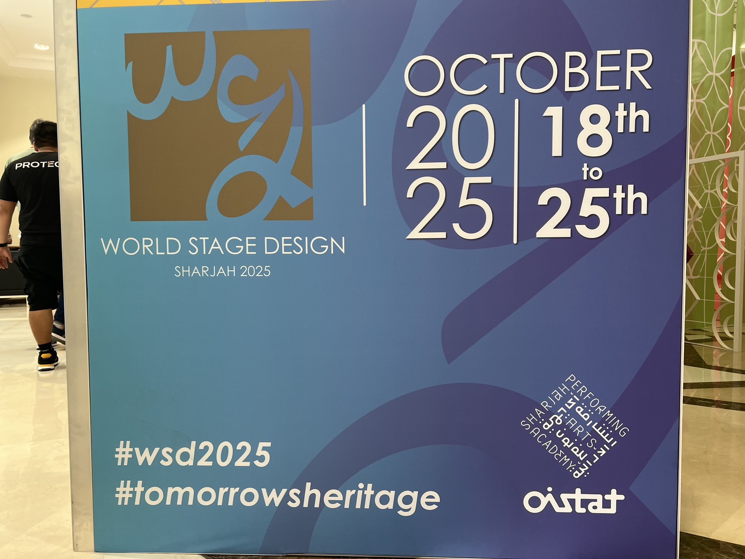 世界劇場設計展World Stage Design 四年舉行一次,本屆由阿拉伯聯合大公國的沙迦(Sharjah)奪下主辦權,WSD曾辦在加拿大、韓國、英國,也曾來過臺北。OISTAT總部的工作就是確保每屆的WSD都能運作順利,此回是首度於沙漠國家舉行,處處充滿驚奇。