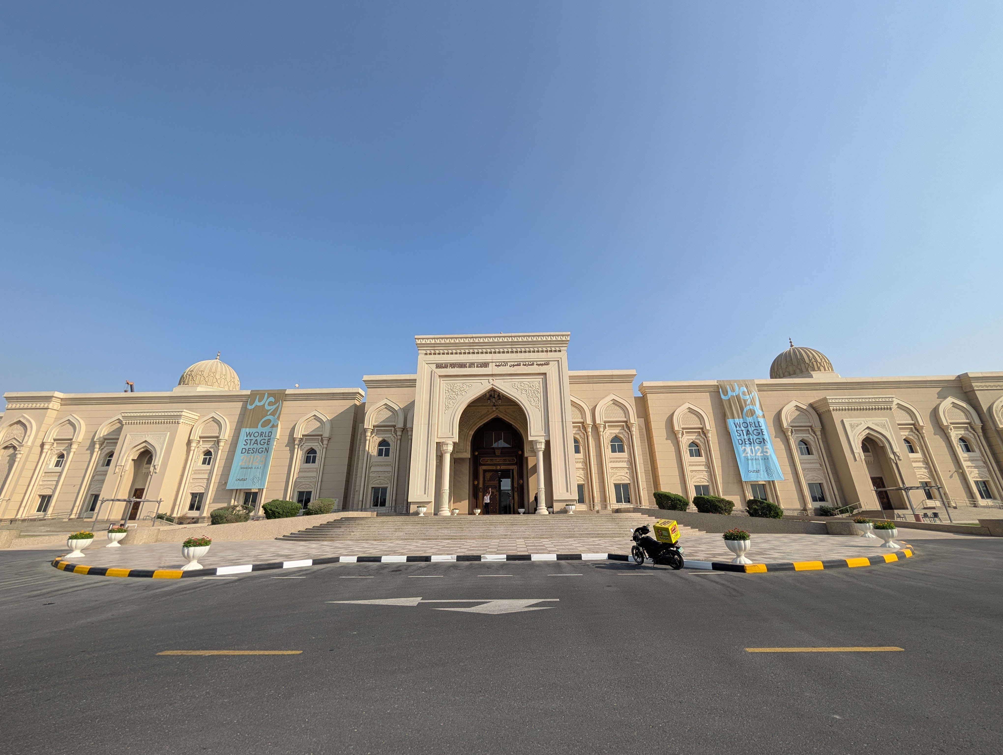 沙迦表演藝術學院高高掛起WSD大旗,沙色與淺藍,襯著土色建築立面與藍天,每一寸都完美和諧,臺灣同事笑說「這選色,我釋懷了」